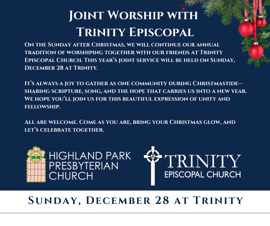 On the Sunday after Christmas, we will continue our annual tradition of worshiping together with our friends at Trinity Episcopal Church. This year’s joint service will be held on Sunday, December 28 at Trinity.